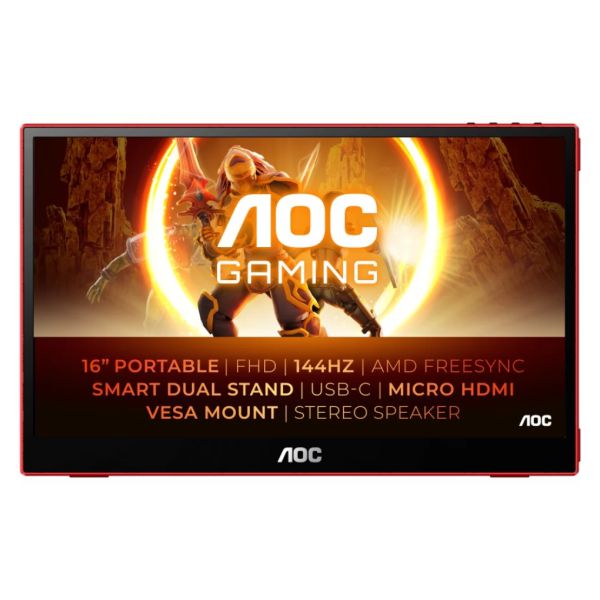 AOC Monitor 16G3 Gaming 15.6”, FHD 1920×1080, IPS, 144Hz, 4ms, FreeSync, 1000:1, 250cd/m2, 1xMicroHDMI, 1xUSB-C, speakers