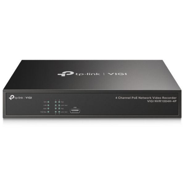 TP-Link VIGI NVR1004H-4P 4 Channel PoE Network Video Recorder, H.265+/H.265/H.264+/H.264, Up to 8MP resolution, 4× 10/100 Mbps PoE+ Ports, PoE budget 53W, 1× SATA Interface(up to 10 TB), 2× USB 2.0, 1× HDMI, 1× VGA, 80 Mbps Incoming Bandwidth