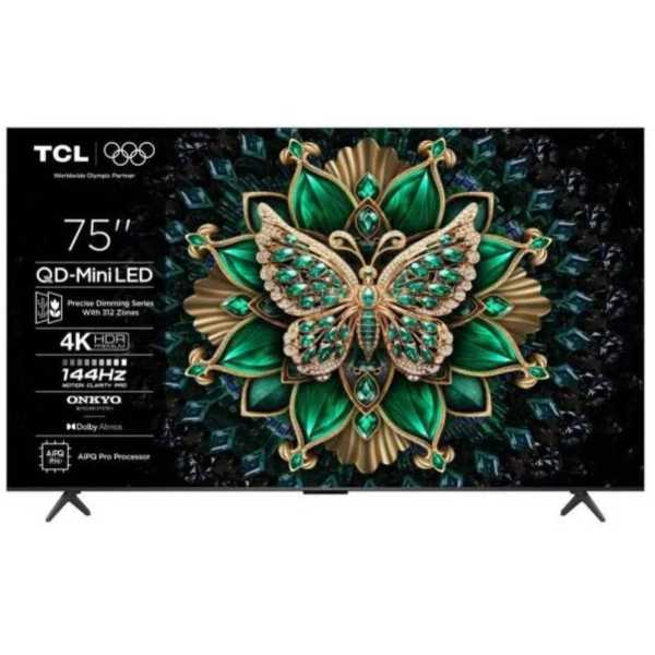 TCL 75”C6K 4K QD-Mini LED TV; 144Hz native display; Precise Dimming Series; Google TV; Game Master; Dolby Atmos; Onkyo 2.1; HDR Premium; HDR10+ HDR10 HLG; Netflix Youtube Amazon Prime Apple TV; Chromecast & T-cast; HDMI: 4x 2.1; USB: 1x 3.0;
