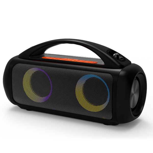 Horizontalni stereo Bluetooth zvučnik, Ugrađena KARAOKE funkcija, Bluetooth 5.3, TWS funkcija (mogućnost bežičnog uparivanja drugog zvučnika), Mp3 player, Podržava mikro SD memorijske kartice i USB uređaje za masovnu pohranu, Izlazna snaga: RMS 60W, PMPO 1200W, 2×3” zvučnici, Pojačalo zvuka i basa – 2×3” pasivne membrane, Frekvencijski odziv: 100 ~ 20000Hz, Kontrola glasnoće,Ekvilajzer zvuka (ekvilajzer), 6,3 mm priključak za mikrofon, AUX utičnica, Napaja se 5V USB-C kabelom, Ugrađena litij-ionska baterija za do 16 sati reprodukcije, Šareno RGB osvjetljenje zvučnika u obliku prstena, Ručka i naramenica za lakši transport, IPX5 vodootporan, Dimenzije zvučnika: 355x130x190mm, Težina: 2,37 kg